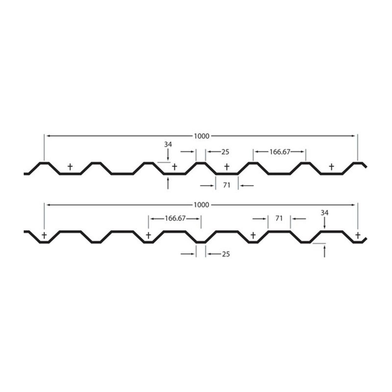 Built to last, this box profile roofing sheet features a high-grade enamel coating that ensures a sleek finish and a lifespan of over 20 years under normal conditions. With a thickness of 0.7mm, it offers versatility, making it ideal for agricultural, industrial, commercial, and domestic applications. The Profile 34/1000 trapezoidal single-skin sheet provides a durable solution with seven rigid profiles spaced 166mm apart across the sheet. Its 34mm profile height ensures a secure, weatherproof lap. Offering an actual width cover of 1000mm, the sheet has undergone independent testing to meet CE EN 14782 standards. Lightweight and cost-effective, this sheet is suitable for installation on roofs with a minimum pitch of four degrees. It can be applied over existing cladding or incorporated into insulated systems for both vertical and horizontal installations on walls and roofs.