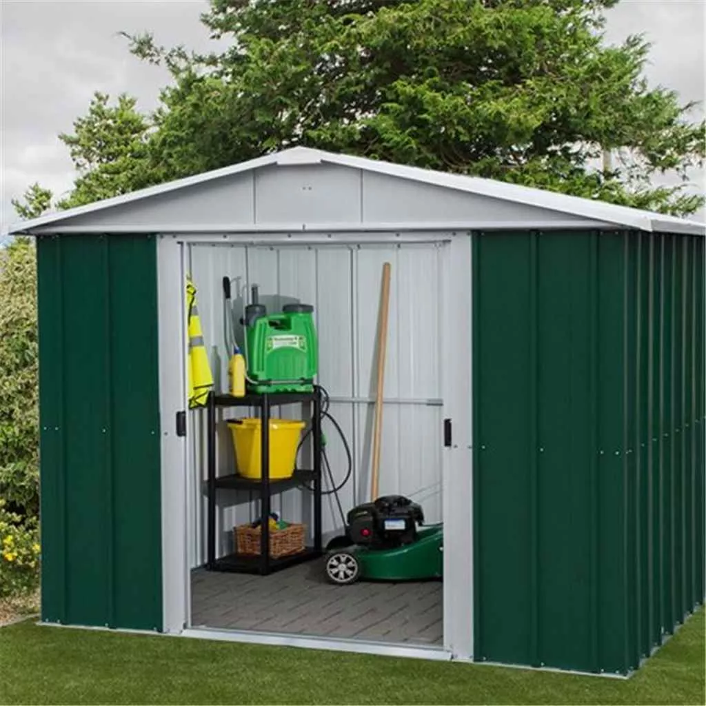 Sliding doors allowing easy access into the shed, 7’5” x 6’10” metal apex shed, excellent garden shed for keeping all your garden appliances inside and is sold to you at a great value.