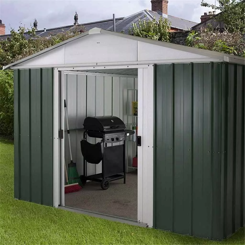 Includes an easy to follow instruction manual, 9’4” x 7’5” metal apex shed, perfect shed for any outdoor space for storing outdoor equipment and has easy access sliding doors.